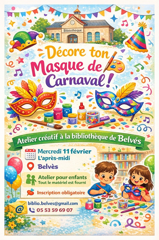 Atelier pour enfant Décore ton masque de carnaval. Sur inscription obligatoire au 05 53 59 69 07