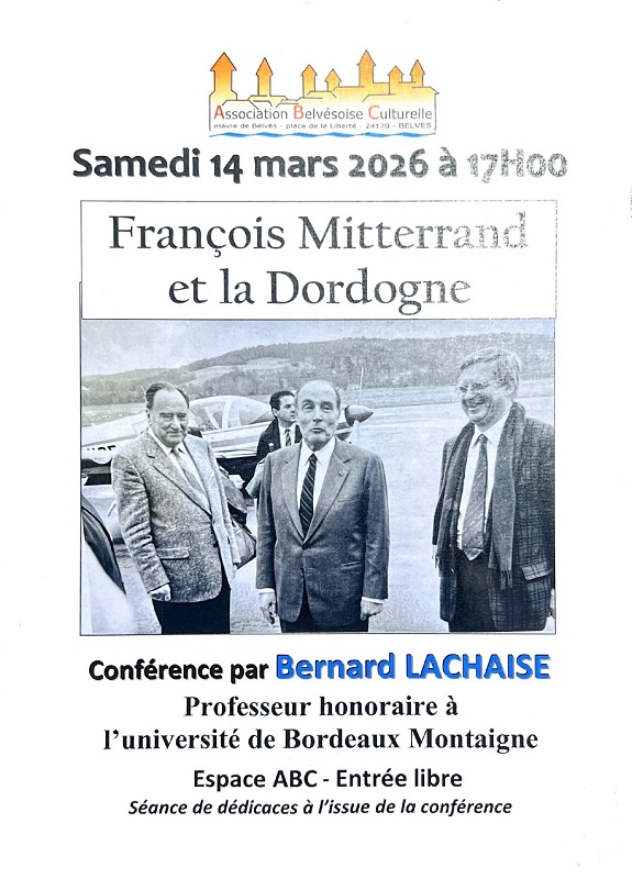 Conférence par Bernard Lachaise :Professeur honoraire d’histoire contemporaine à l’Université Bordeaux Montaigne, Bernard Lachaise est Périgourdin et s’est très tôt intéressé à l’histoire de son département natal. C’est à l’occasion des recherches pour son premier livre qu’il a pu rencontrer François Mitterrand à l’Élysée. Lors de cet entretien, le président de la République lui a parlé de …Ribérac, évoquant un souvenir d’enfance !