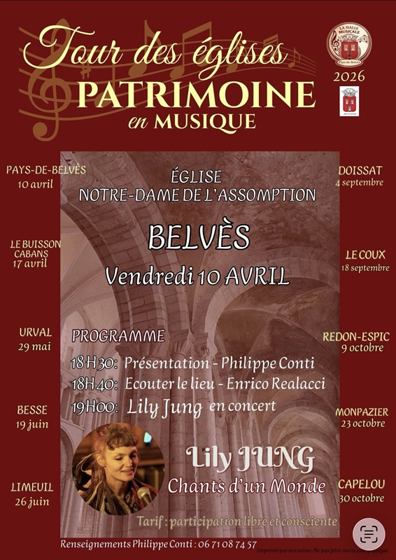 Le 10 avril, à l'Eglise Notre-Dame de l'Assomption de Pays-de-Belvès, concert de Lily Jung.