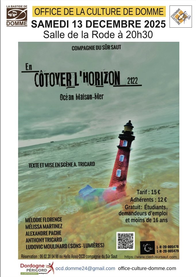L'office de la culture de Domme vous propose de participer à un spectacle de théâtre par la Compagnie du Sûr Saut "En côtoyer l'horizon 2122 Océan-Mer". Texte et mise en scène A Tricard