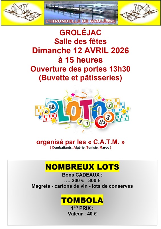 Loto de Groléjac dimanche 12 avril à 15h00 à la salle des fetes.