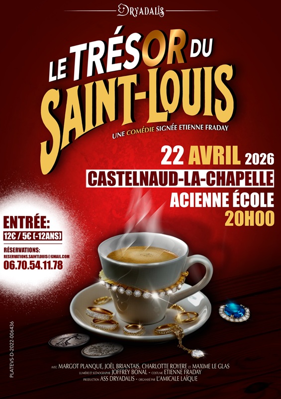 Théâtre : "Le trésor de Saint-Louis" de Etienne Fraday à 20h00 à la salle de l'ancienne école dans le Bourg. Réservations au 06 70 54 11 78.