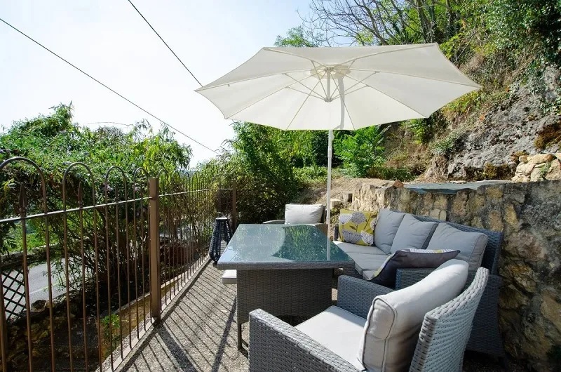 Deux terrasses dont une, avec un salon de jardin, offrent une belle vue sur la vallée. En surplomb, vous pouvez profiter du spa et de la grotte privative équipée d'un coin repas et d'un coin détente avec un billard, une table de jeux et une enceinte Jukebox Bluetooth. La cour extérieure est commune aux deux gîtes et donne accès au carport qui permet le stationnement de 2 véhicules.